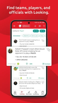 👥 Find Cricketers – Discover players from your contacts and follow their journey. Cheer for them, and celebrate their top performances.