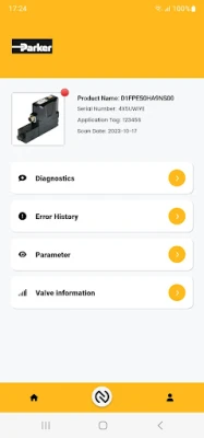 The Parker Device Connect app provides a quick overview about the current status of Parker devices equipped with an NFC interface. The diagnosis of the devices is possible when it is switched-on and without power supply.