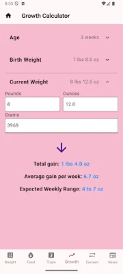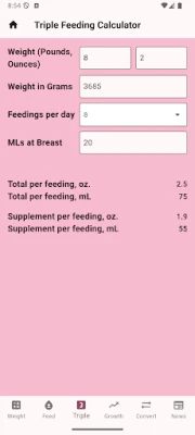 * Settings Panel: Customize app behavior, including unit preferences (Metric Only mode). * Weight Management Calculators: Accurately track and analyze weight loss/gain in newborns. * Feeding Amount Recommendations: Quickly determine optimal feeding amounts. * Weighted Feeding Calculator: Precisely measure milk transfer during feeds. * User-Friendly Interface: Intuitive design for efficient use. * Reliable and Accurate Results: Tools developed with input from professionals.