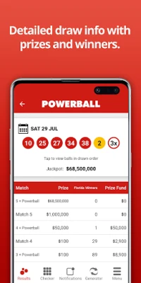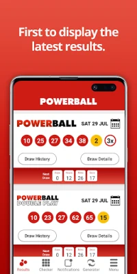 Get the latest Powerball results within moments of the draw taking place. This easy-to-use app shows the Powerball numbers (including Power Play and Double Play) and full prize breakdown including number of winners and prizes paid.
