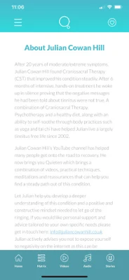 Julian Cowan Hill got back to silence after twenty years of tinnitus. A combination of body-based therapies and practices to settle the nervous system, developing a clear understanding of how this symptom works and finding solid reassurance and advice on what helps let go of tinnitus gets you firmly onto the path to recovery. Quieten is packed full of practical advice, understanding, comforting information and many tips that will benefit you.