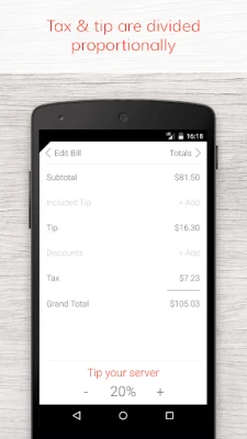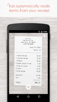 Tab is the simple way to split a bill among friends. Snap a pic of the check and tap your items to claim them. Tax and tip are calculated for you. No more back-of-the-napkin algebra or typing in prices by hand!