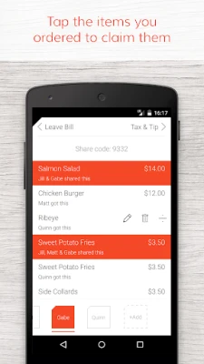 • Select which items each person ordered. Everyone with Tab on their phone can join onto the bill and select their own items – Tab keeps everything synced in real time.